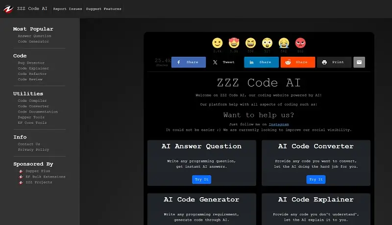 ZZZ Code AIは、高度な人工知能技術によりコーディングの効率性と正確性を向上させることを目的とした革新的なオンラインプラットフォームです。この多機能なウェブサイトは、あらゆるスキルレベルのプログラマーを対象としており、コーディングプロセスを合理化し、コードの品質を向上させるツール一式を提供しています。