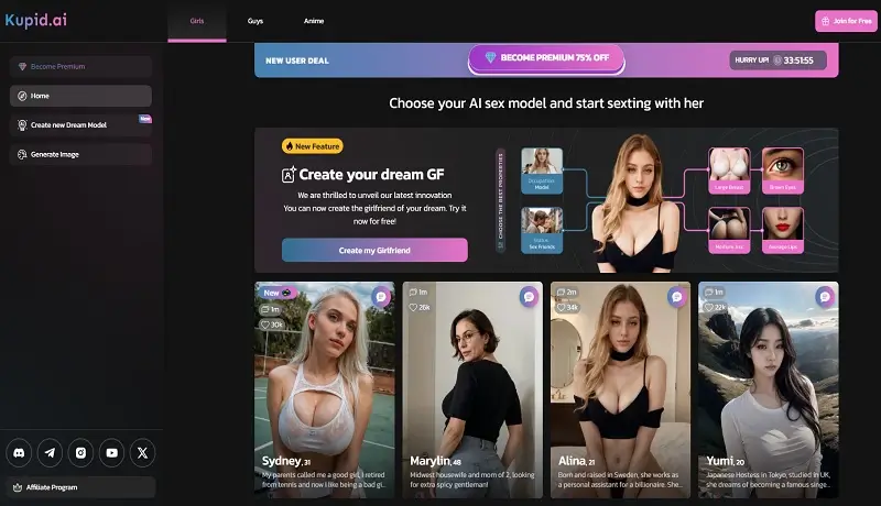 Kupid AI este o aplicație web avansată de sex chat cu inteligență artificială care permite utilizatorilor să își creeze propria iubită personalizată cu inteligență artificială. Dacă doriți să creați partenerul perfect, Kupid AI vă poate ajuta. Puteți proiecta totul, de la aspect la voce. Sau, puteți alege dintr-o gamă de prietene cu inteligență artificială disponibile. Kupid AI oferă o experiență captivantă pentru toată lumea.