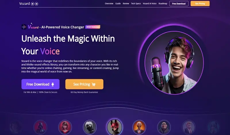 Vozard este software-ul de schimbare a vocii care redefinește limitele vocii tale. Cu ajutorul bibliotecii sale de efecte sonore bogate și realiste, vă puteți transforma în orice personaj doriți în timp real, indiferent dacă discutați online, jucați, transmiteți live sau creați conținut.