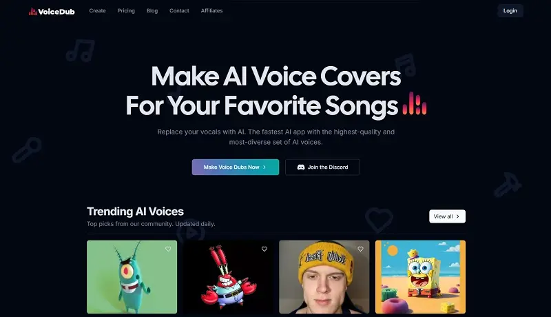 VoiceDub ist die Lösung. Der Song-Cover-Generator mit künstlicher Intelligenz ersetzt mühelos Ihren Gesang durch atemberaubende, von künstlicher Intelligenz erzeugte Stimmen und bringt Ihre Cover-Kreationen auf ein völlig neues Niveau.